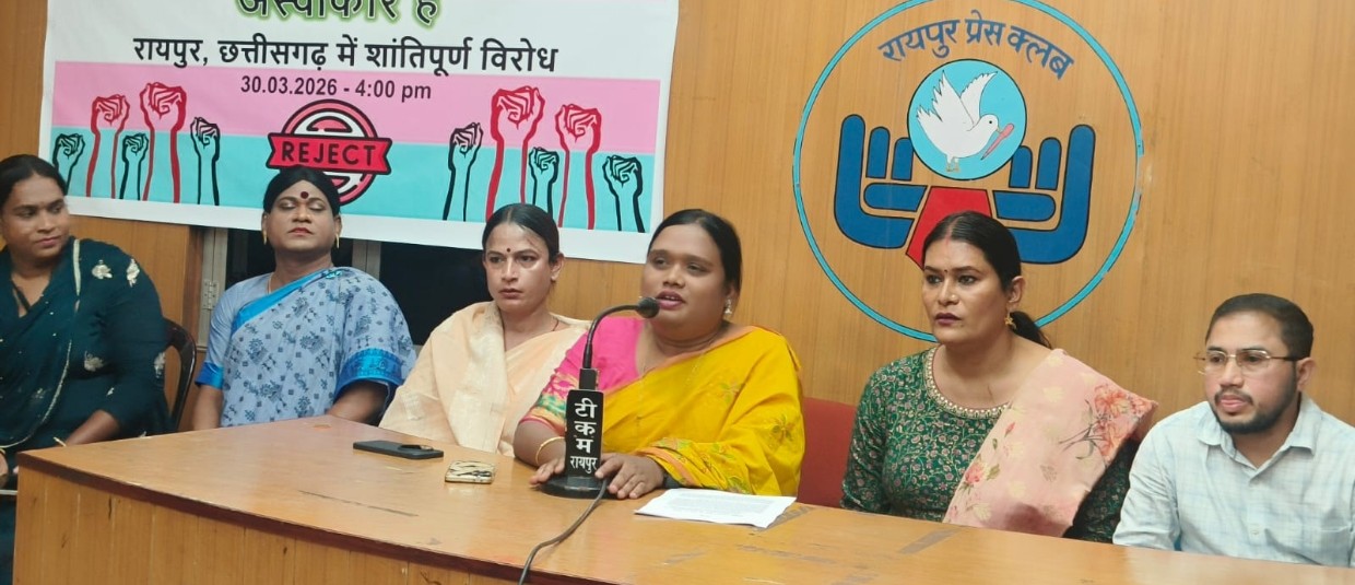 रायपुर- छत्तीसगढ़ मितवा संकल्प समिति द्वारा संसद भवन के दोनों सदनों में पारित उभयलिंगी व्यक्ति (अधिकारों का संरझण) कानून संशोधन विधयेक 2026 के विरोध में 30 मार्च 2026 को रायपुर प्रेस क्लब में प्रेस वार्ता का आयोजन किया गया। किया। इस प्रेस वार्ता में समिति के पदाधिकारियों के अलावा सामुदायिक लीडर भी सम्मिलित हुए। इस प्रेस वार्ता में राष्ट्रीय ट्रांसजेंडर परिषद के पूर्व जोन की सदस्य व छत्तीसगढ़ मितवा संकल्प समिति की अध्यक्ष विद्या राजपूत ने बताया कि यह नया कानून पूरे तृतीय लिंग समुदाय के पहचान के अधिकारों का हनन करता है। इस कानून के अंतर्गत केवल कुछ सीमित वर्गों को ही शामिल किया गया ह, जबकि ट्रांसमेन और ट्रांसवूमेन, नानबायनरी व जेंडर क्ववीर समुदाय के समूह को निकाल दिया गया है। इस कानून में पूरे ट्रांसजेंडर समुदाय को एक अपराधी के रुप में प्रस्तुत किया गया है। इसी प्रकार इस कानून के धारा 18 को इस प्रकार बनाया गया है कि जिससे कोई भी व्यक्ति किसी भी किन्नर गुरु व उनके परिवार वालों को झूठे मुकदमे में फंसा सकता है। उन्होनें बताया कि इस कानून में संशोधन लाने के लिए समुदाय के व्यक्तियों के साथ किसी भी तरह का परामर्श नहीं किया गया। समुदाय विद्या राजपूत ने प्रेसवार्ता के माध्यम से केन्द्र सरकार को तत्काल इस कानून को रद्द करने की मांग की है। विद्या राजपूत ने प्रस्तावित कानून में मेडिकल बोर्ड के गठन के प्रावधान पर कड़ी आपत्ति जताई। उन्होंने कहा,