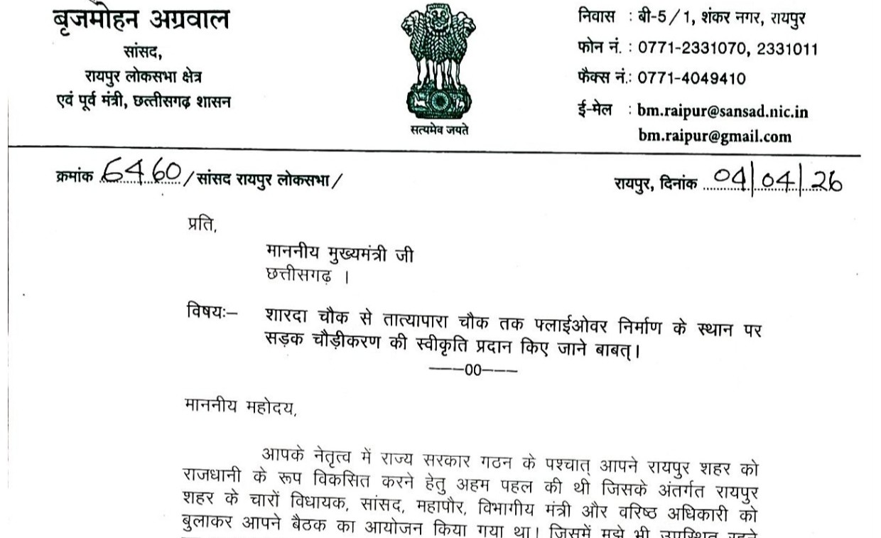 सांसद श्री बृजमोहन अग्रवाल ने मुख्यमंत्री से विनम्र आग्रह किया है कि जनहित को सर्वोपरि रखते हुए फ्लाईओवर निर्माण के निर्णय पर पुनर्विचार कर शारदा चौक से तात्यापारा चौक तक सड़क चौड़ीकरण के कार्य को प्राथमिकता दी जाए, ताकि राजधानीवासियों को सुगम, सुरक्षित और व्यवस्थित यातायात की सुविधा मिल सके।