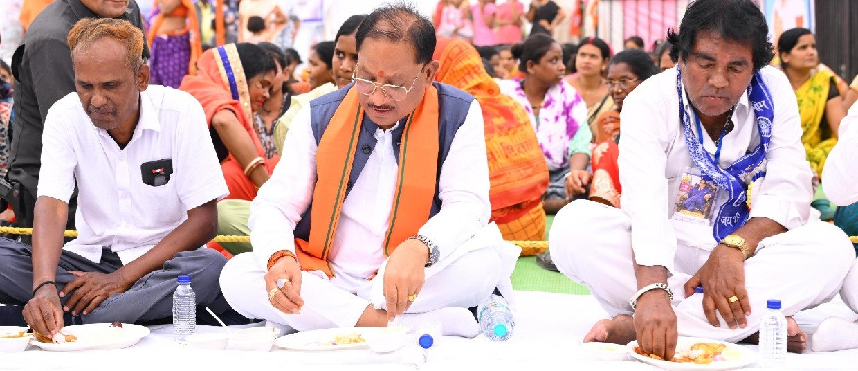 रायपुर 14 अप्रैल 2026/मुख्यमंत्री श्री विष्णु देव साय आज राजधानी रायपुर के शंकरनगर स्थित दुर्गा मैदान में डॉ. भीमराव आंबेडकर की 135वीं जयंती के अवसर पर आयोजित समरसता भोज कार्यक्रम में शामिल हुए। इस दौरान मुख्यमंत्री श्री साय ने जनप्रतिनिधियों और आमजन के साथ बैठकर भोजन किया तथा स्वयं लोगों को भोजन परोसकर सामाजिक समरसता का संदेश दिया।